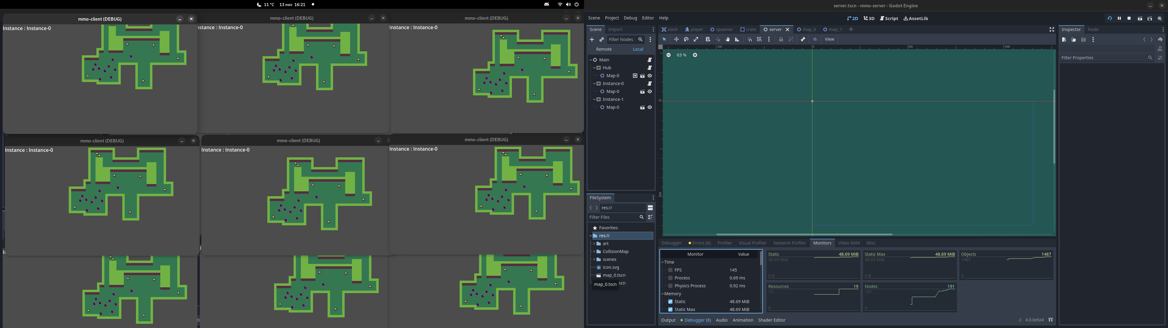 The initial tests were very promising. Sukkoy very quickly put together a simple test, a game client with a standalone dedicated server, both in Godot. First we just connected a bunch of game clients to the server and ran around, then we added some bots, and attacks, fixing issues and figuring things out along the way. Performance seemed quite good, so we excitedly moved onto fleshing out the game design, art and even a bit of lore, to give the game some identity.