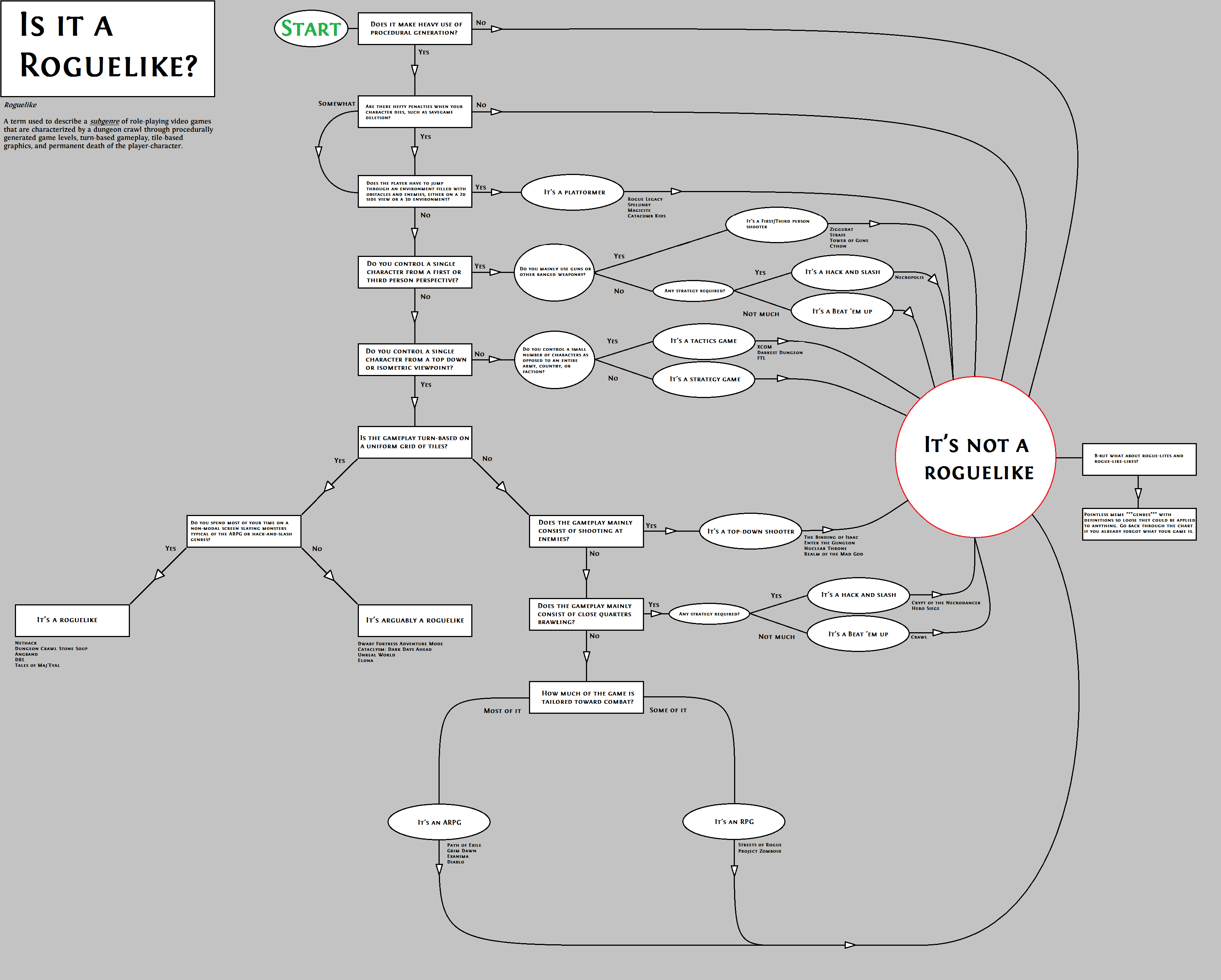 The chart overlaps a lot with the Berlin Interpretation, except it also says that a roguelike is strictly top-down or isometric (no first or third person camera) and lists a bunch of genres that you should define your game with rather than roguelike if it breaks one of the “rules” along with some examples.